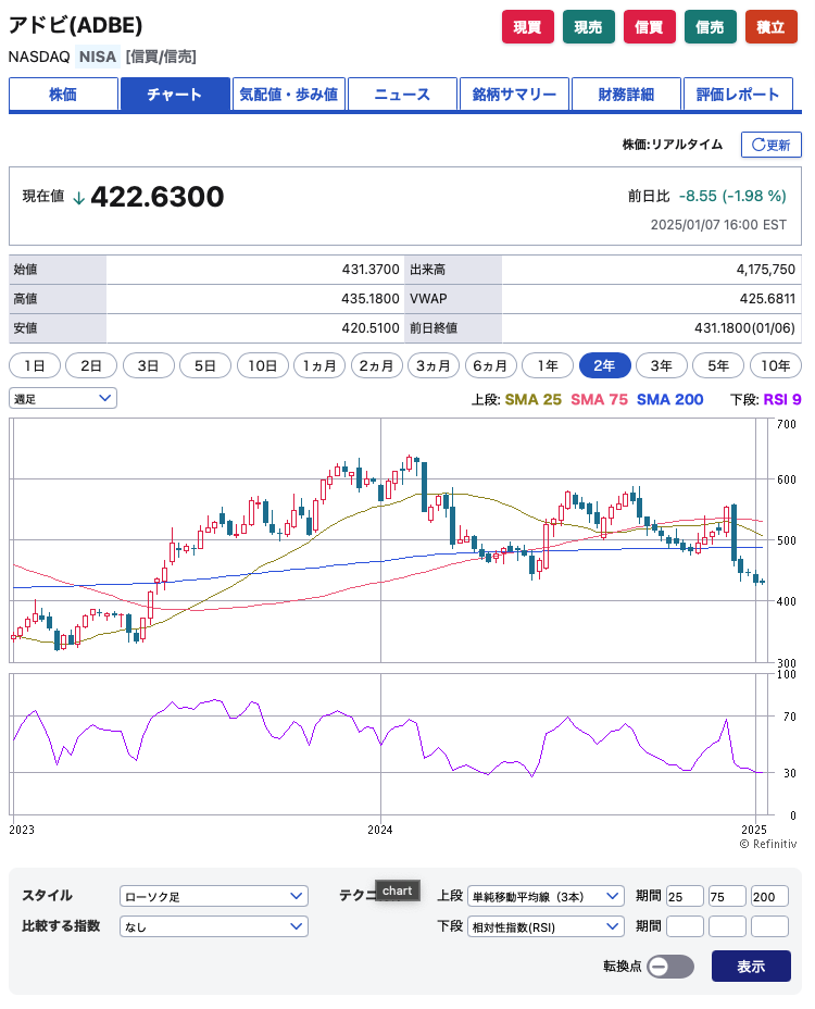 Adobeは有名な企業であるが、マーケットは成熟している物だと考えている。その為、飛躍的な売上上昇は見込めないだろうと思う。例えAIが進歩しても、マーケット規模の大きさはさほど変わらない業種なのではと思う。そして、ほとんどの投資家はそう考えている為、今株価は低迷をしているのだろうと思う。しかし、将来徐々に売り上げを伸ばしていくだろうと予測すると、ファンダメンタルズ的に考えて株価も徐々に上がっていくだろうと思う。そう考えると、長期で保有するかしないかの2択になる。
