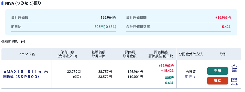 積立NISAを再び初めて11ヶ月が経ちました。現在、評価損益率+15.42%の評価損益+16,963円です。先月は評価損益率+16.52%の評価損益+16,520円でしたので、評価損益率は下がりましたが、評価損益は僅かですが上がりました。